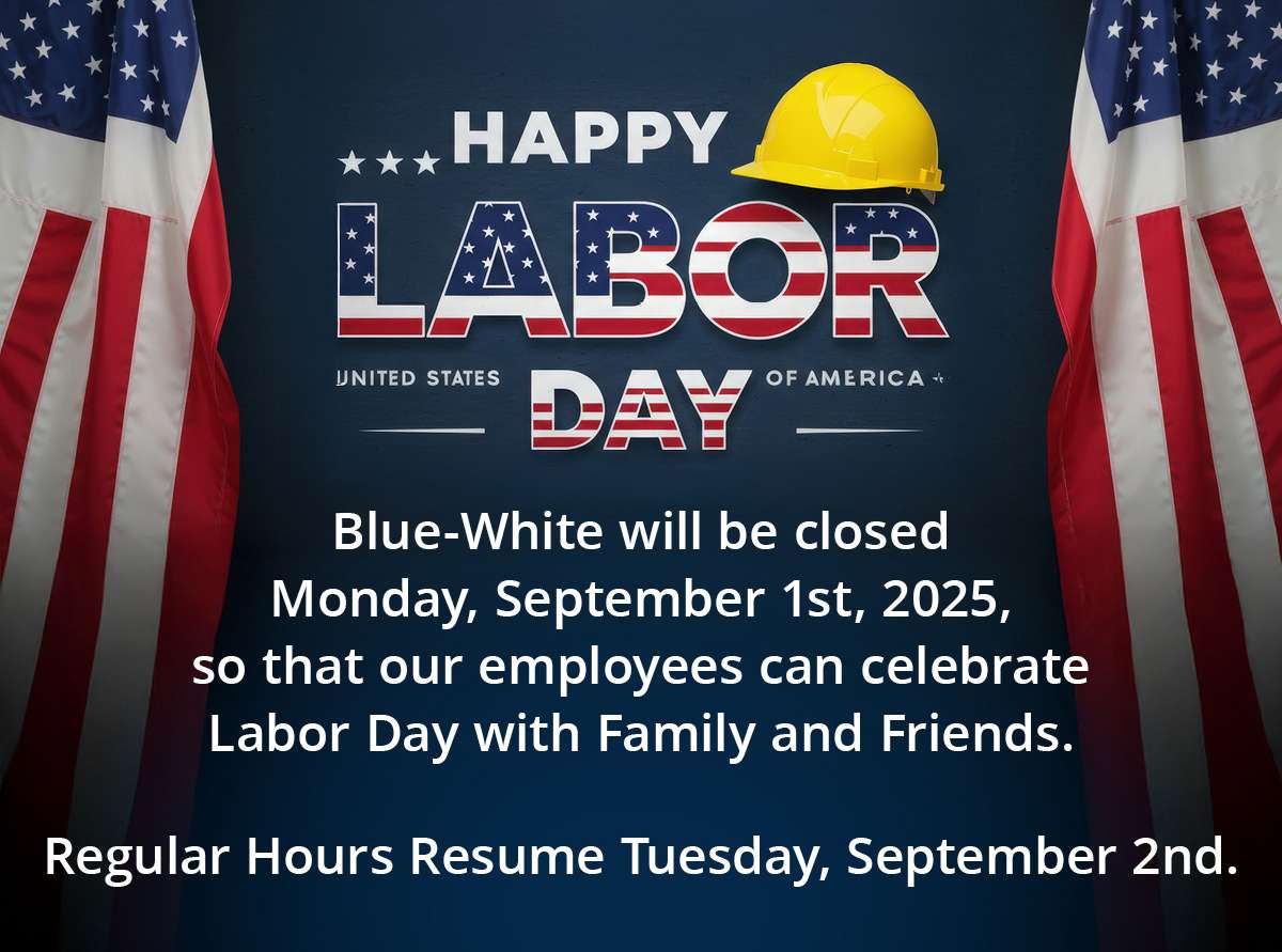 Blue-White will be closed Monday, September 1st, 2025, so that our employees can celebrate Labor Day with Family and Friends.